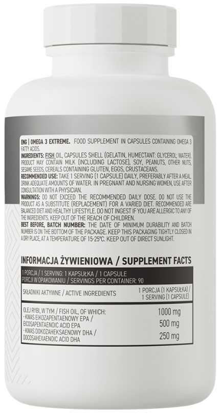 Високий вміст омега-3 жирних кислот: Кожна капсула OstroVit Omega-3 Extreme містить значну кількість поліненасичених жирних кислот, таких як EPA і DHA. Ці речовини важливі підтримки роботи серця, мозку і зору.