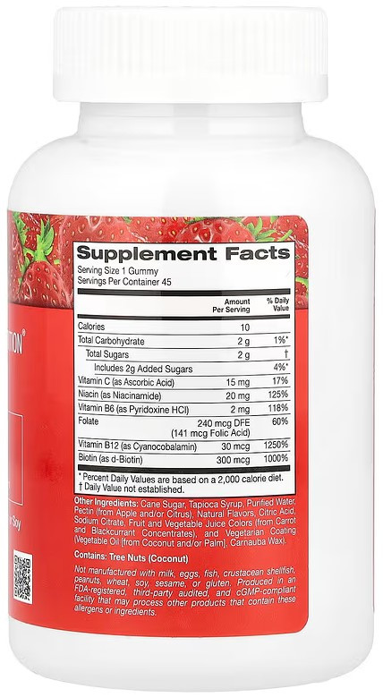 Здоров'я шкіри, волосся та нігтів: Біотин та інші вітаміни групи В сприяють здоров'ю шкіри, волосся та нігтів, запобігаючи ламкості та підтримуючи природний блиск.