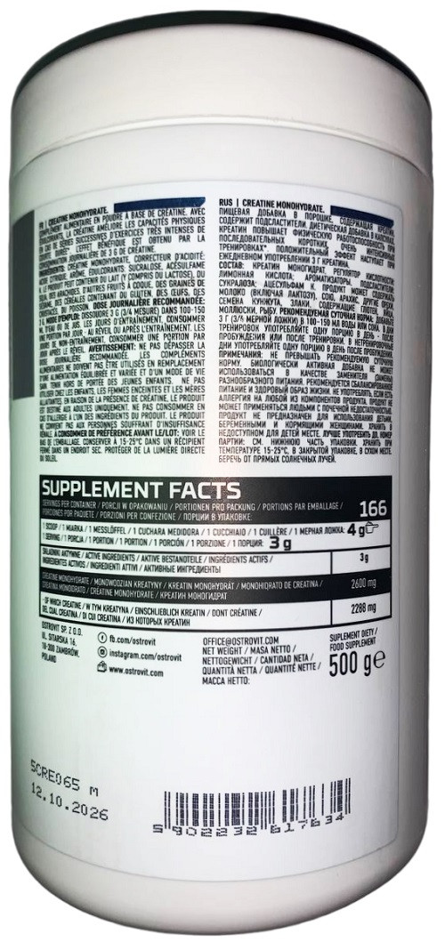Опис OstroVit Creatine - являє собою високоефективну спортивну харчову добавку, що містить креатин моногідрат, який багаторазово збільшує ефект в об'ємному зростання м'язів. Креатину сприяє зростанню м'язової маси і збільшення силових показників. Харчові добавки, що містять креатин, є одними з найбільш популярних на ринку спортивного харчування. Доведено, що прийом креатину в період інтенсивних фізичних навантажень і стимулює зростання м'язової тканини, підвищує силу і витривалість. Креатин не тільки корисний для активно тренуються атлетів, але при правильному застосуванні абсолютно нешкідливий для організму.