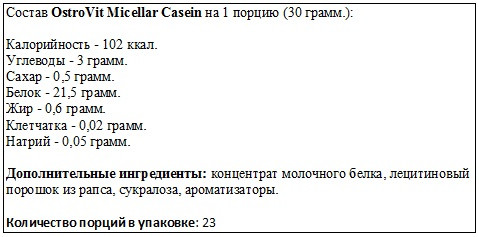 OstroVit Micellar Casein - це протеїнова матриця на основі міцелярний казеїн. Він один із найдовших по засвоєнню білків, що дозволяє довго живити м'язові тканини корисними та необхідними амінокислотами. Прийнявши порцію протеїн казеїн на ніч, Ви, безперечно, отримаєте всі необхідні амінокислоти для формування мускулатури навіть під час відпочинку, а так само швидке відновлення, адже всім відомо, що без правильного відновлення Ви не отримаєте бажаного результату. Час дії казеїну близько 7-8 годин, саме тому він має тривалу антикатаболічну властивість (запобігає розпаду м'язових волокон), що властиво лише міцелярному казеїну. Цей комплекс підвищує силові показники, заповнює дефіцит поживних речовин та амінокислот, прискорює час відновлення після інтенсивних навантажень. Ідеально підходить казеїн для схуднення і набору маси тіла, допомагаючи якнайшвидше досягти бажаних результатів. Адже Островіт Міцеляр Казеїн містить низький відсоток вуглеводів і жирів, що буде ідеальним замінником прийому їжі в період сушіння. А також містить великий відсоток білка, що буде ідеальним під час масонабору.